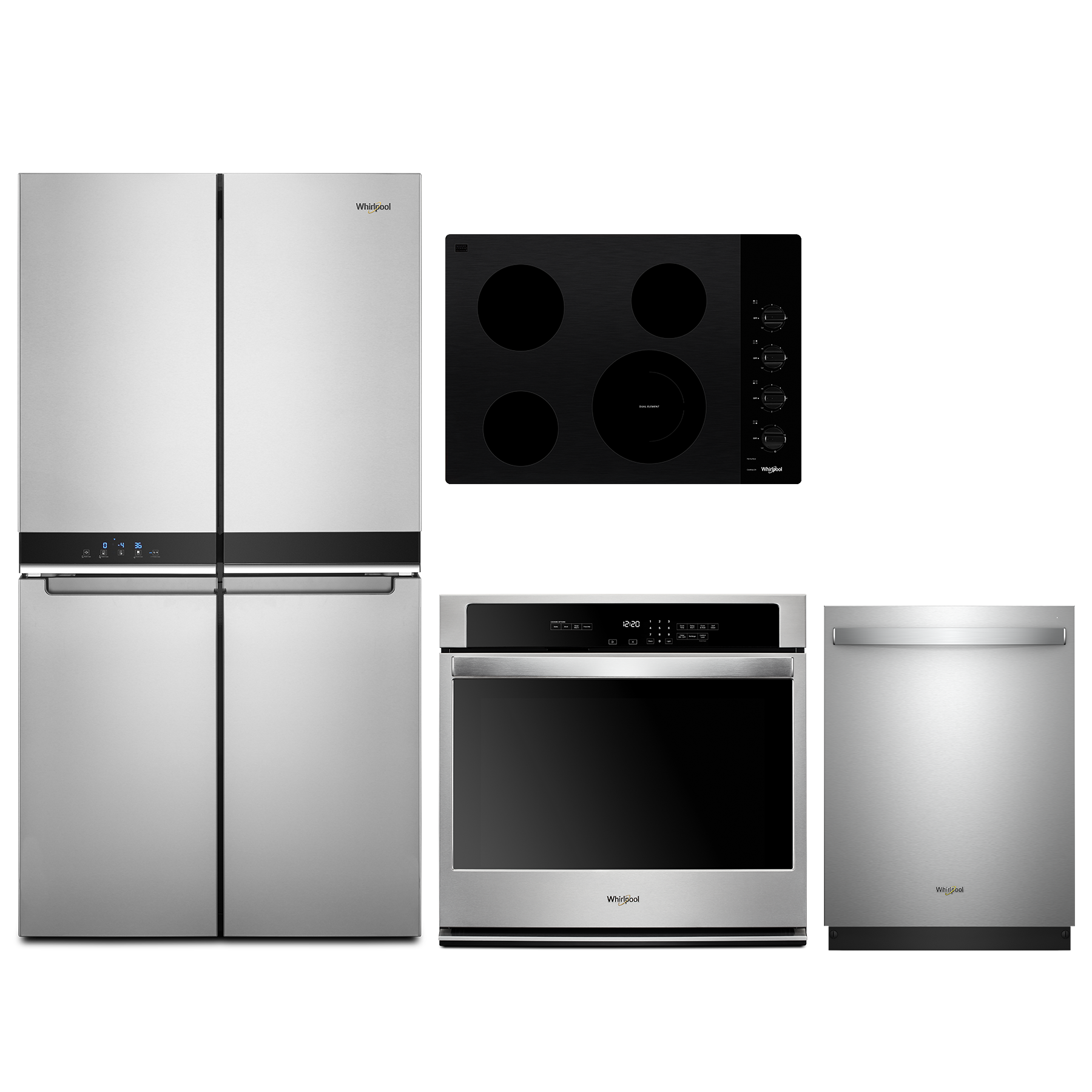 Whirlpool® 4 Piece Kitchen Package-Stainless Steel with a Counter Depth French Door Refrigerator, Electric Cooktop, Built In Dishwasher, and Electric Single Oven Built InRead More